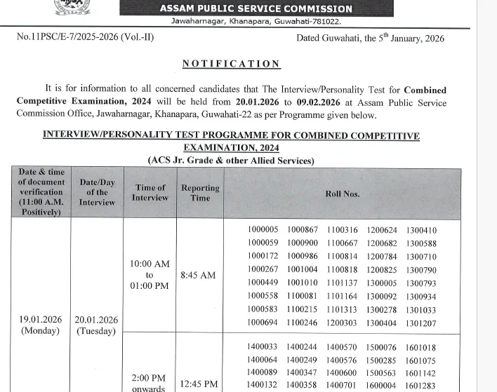 The Assam Public Service Commission (APSC) has officially released the Interview / Personality Test schedule for the Combined Competitive Examination (CCE) 2024. This final stage of the selection process plays a decisive role in determining the final merit list for ACS Junior Grade and other Allied Services, as it evaluates candidates’ personality, administrative aptitude, and overall suitability for public service.
