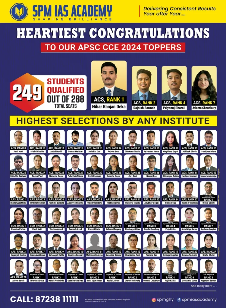 For the fourth consecutive year, SPM IAS Academy students have secured the highest number of selections in the APSC CCE, reinforcing its reputation as a leading APSC coaching institute in Assam.