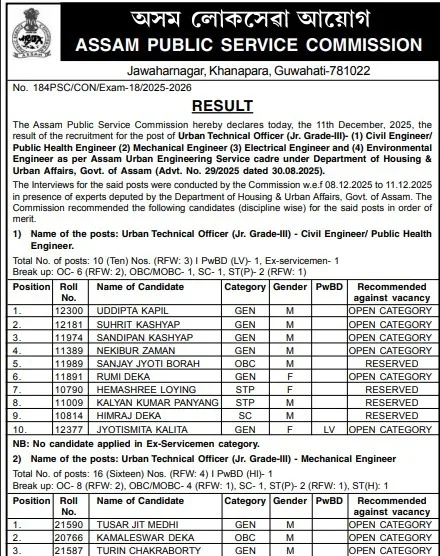 The result marks the completion of a key technical recruitment process for APSC in 2025, offering a prestigious opportunity for engineering graduates to gain stable government service and a scope for long-term career growth in Assam’s public infrastructure and urban development sector.