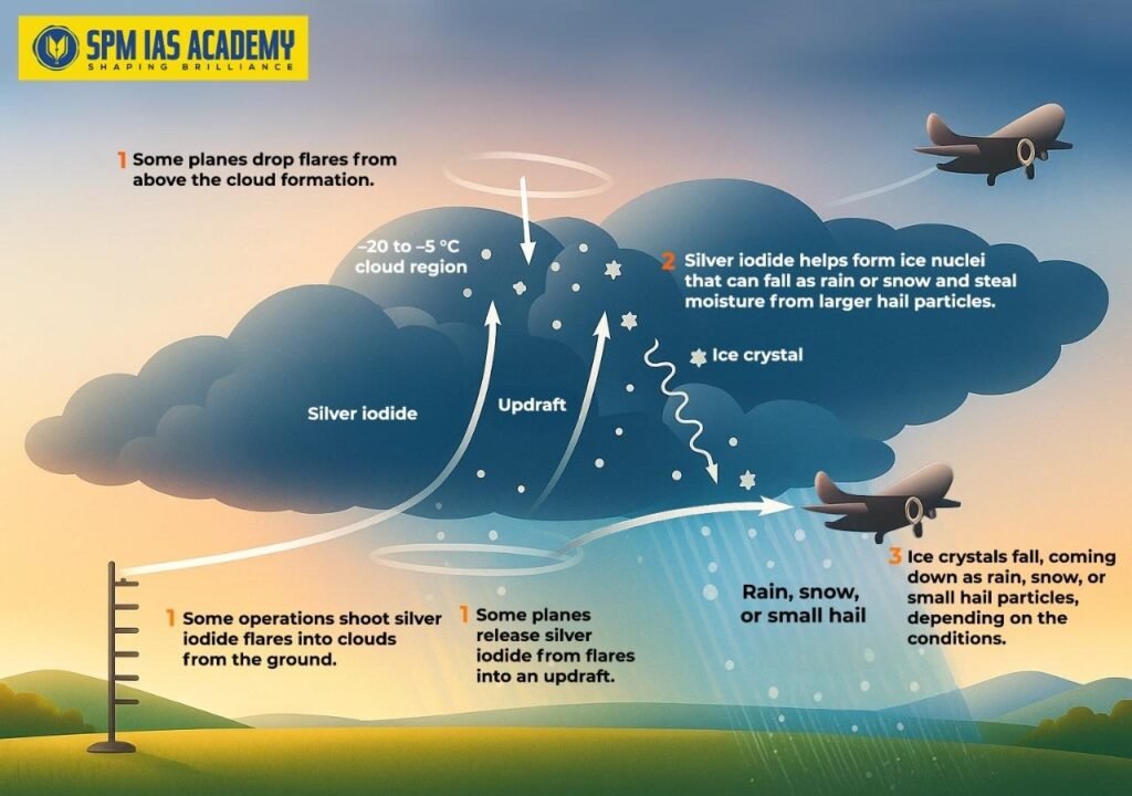 Cloud seeding holds significant relevance for the UPSC exam syllabus. It mainly deals with the subjects of Geography, Environment, Science and Technology, and Current Affairs. As a weather modification technique, it links scientific innovation with pressing environmental issues such as air pollution, drought management, and climate change adaptation. Understanding the principles, methods, benefits, and challenges of cloud seeding helps aspirants analyze India’s responses to environmental crises, particularly in cities like Delhi, facing severe air pollution.