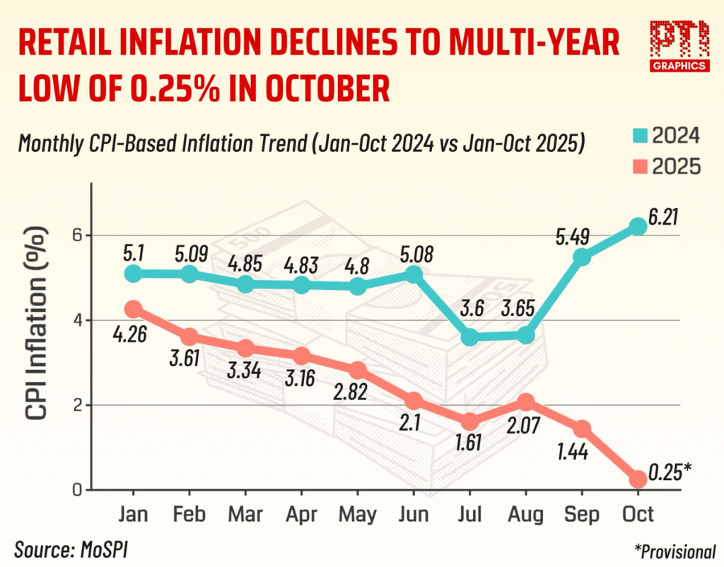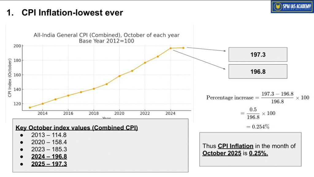 Retail inflation in India has recorded a historic low. The Consumer Price Index (CPI) inflation rate fell to 0.25% in October, 2025. It is the lowest value ever since the current CPI series began in 2012. This development has major implications for the Indian economy, monetary policy, and future interest rates.