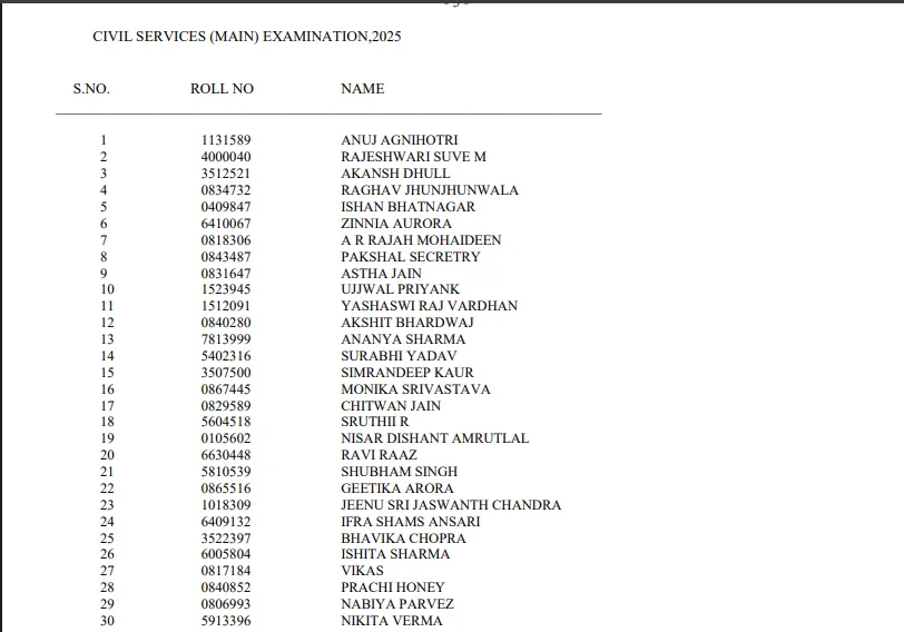 Step 3: Click on the link titled “UPSC Final Result 2025 – Civil Services Examination.” This will open the result PDF containing the names and roll numbers of candidates who have successfully cleared all three stages of the examination — Preliminary, Mains, and Interview.