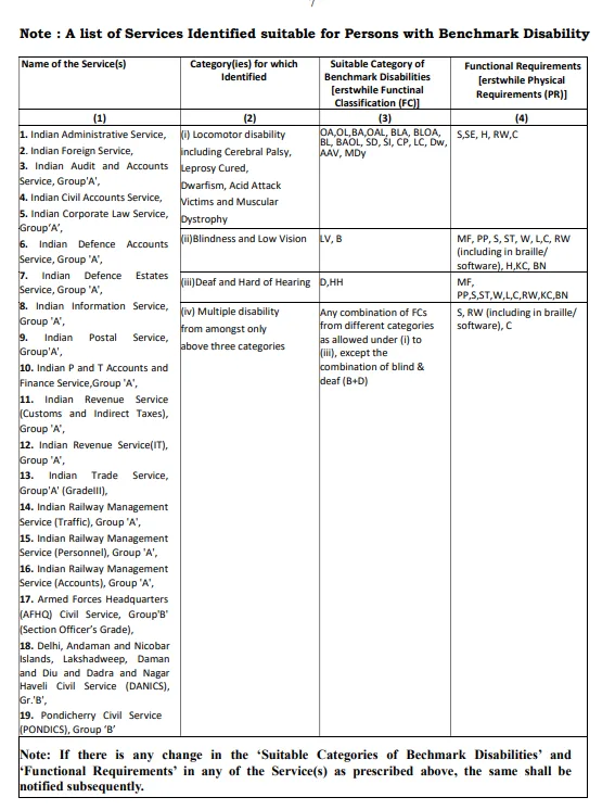 | Indian Information Service, Group ‘A’ | Locomotor Disability, Low Vision, Deaf, Hard of Hearing | S, RW, KC, BN |